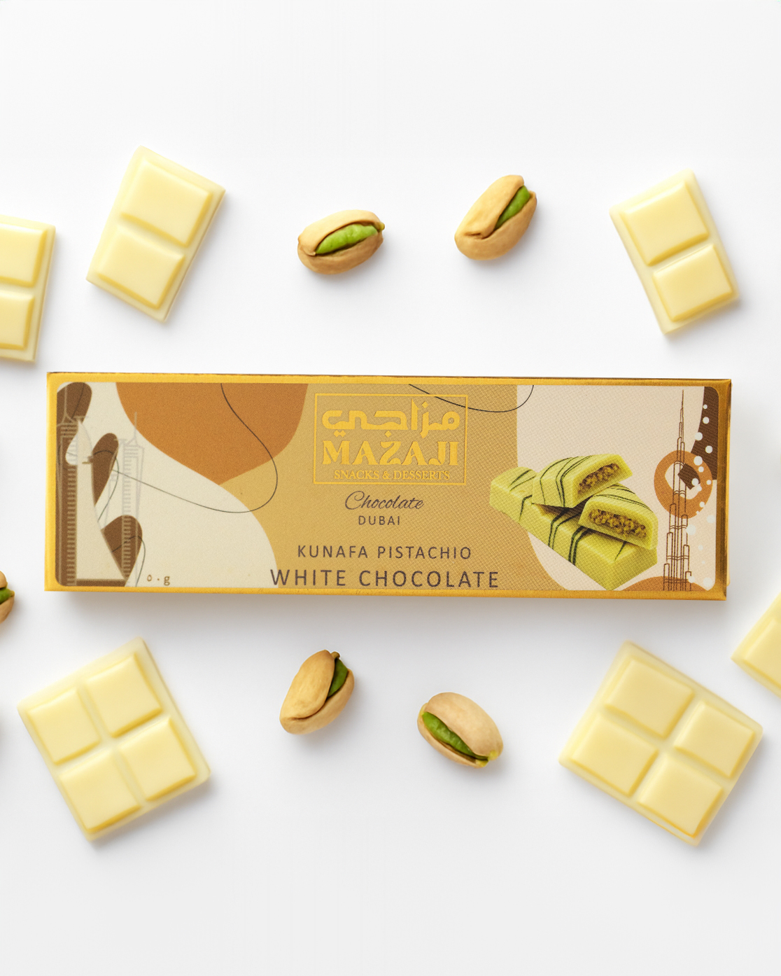 Delight in the luxurious taste of Mazaji White Chocolate with pistachio and kunafa – handcrafted in Dubai for a truly unique indulgence. This 50g bar blends creamy white chocolate with crunchy textures and Middle Eastern flair.